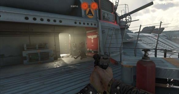 [2]回去找安雅 接着要返回找安雅,打开另一扇大门出门来到灭绝者号外部。这里的地形和第一章时一样,暗杀掉第一个指挥官后,可以看到旁边的镭射炮台,利用镭射炮台清理远处的敌人,不过要小心,部分纳粹士兵会绕到你背后攻击。