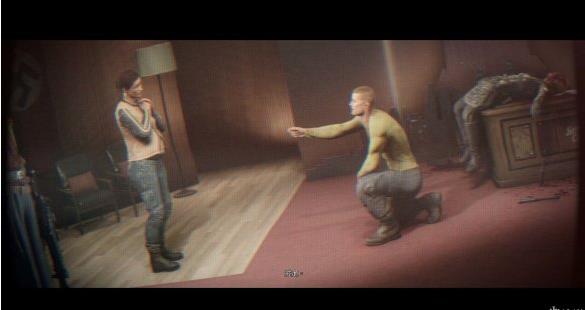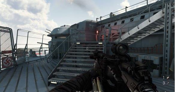 触发剧情,一个纳粹兵扑了上来,最后紧要关头,女友安雅出现,杀了纳粹兵。尽管后面还有敌人,但是仍然不能阻止男主和女友秀恩爱。秀完恩爱之后,男主和女友还有之前的老头罗斯一起到了甲板上。