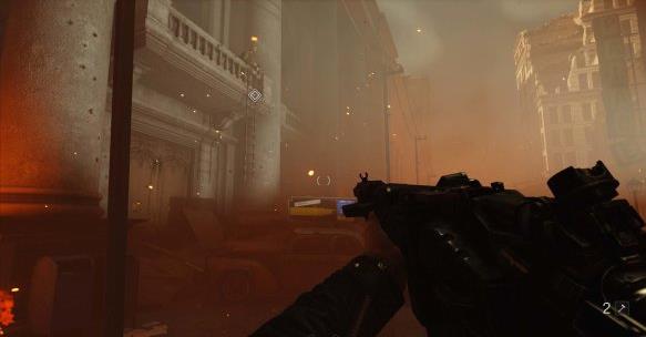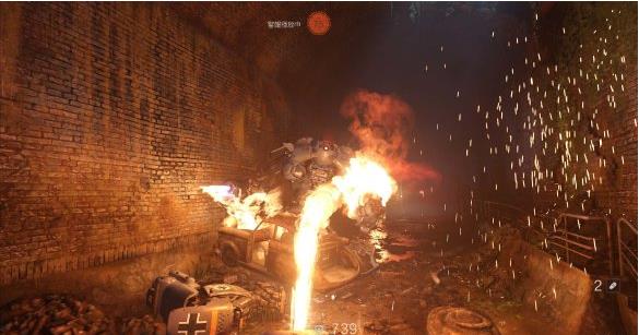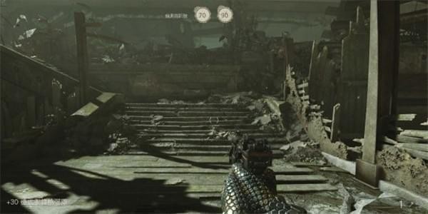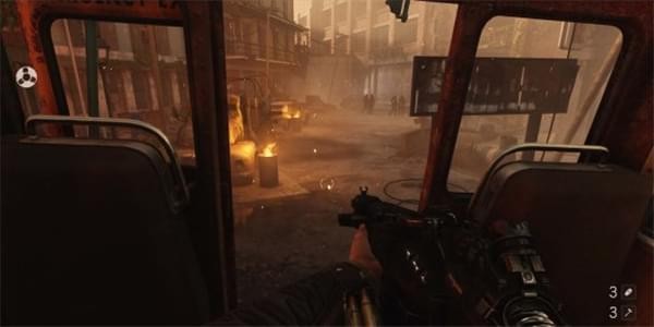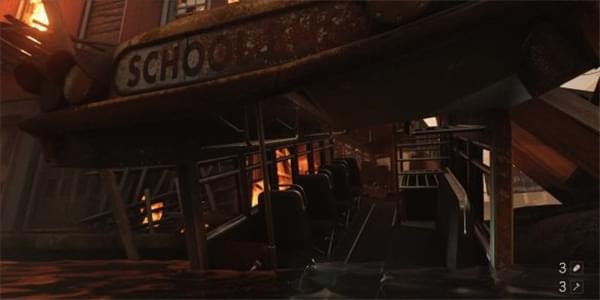 [2]通过大厅堂 继续往前走穿过一片水洼,从一辆破损的校车上岸。校车内可以看到不远处的纳粹士兵。躲在车内干掉敌人,撞开铁门进入大厅堂内。