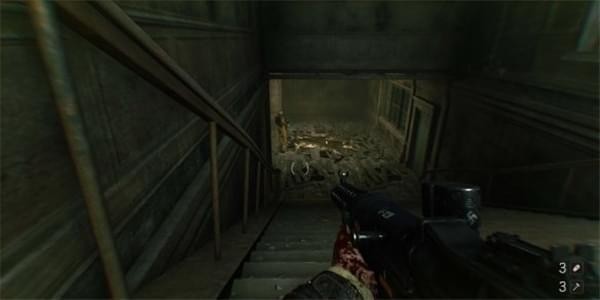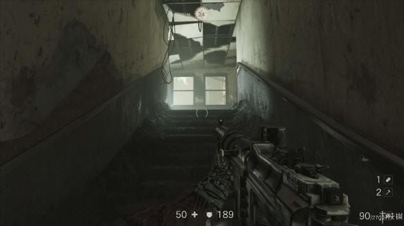 沿路清掉敌人来到一座小楼,小楼通道比较多内部有不少敌人,我们需要活用通道四处游击,沿着楼梯走到三楼,有一处破损的铁质楼梯。