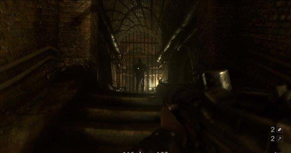 按地图指示走上台阶往左边走就能看到穿生化服的纳粹士兵。