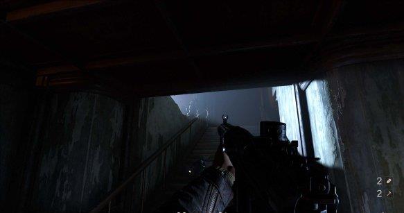 [3]离开圆梯间 下楼梯后来到圆梯间,这时候已有纳粹士兵在那等着,解决后往前走,撞开墙,上楼梯从墙上跳下就离开了圆梯间。