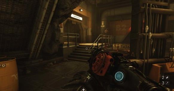 一进门就会触发警报,先往左边走可以拿到一个工具升级包。接着往右边上楼梯。