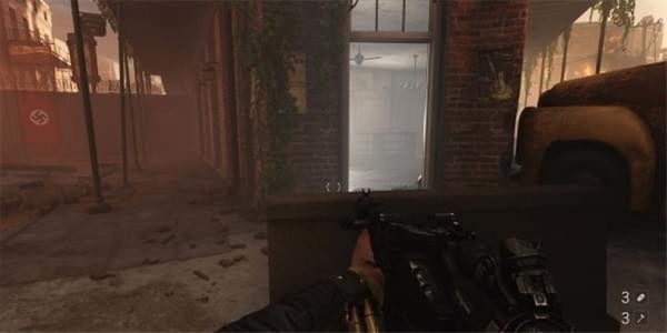[4]协助反抗军 突破重围后,沿着断壁上去,撞开楼上的房门到达美国银行。此时反抗军正和纳粹交火由于出现在纳粹战壕的背后所以可以轻松偷袭掉他们,解决后爬上梯子,结束关卡。