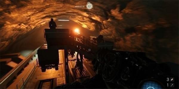 通过地下通道发现纳粹的基地,纳粹已经开发出了火箭列车,首先需要进入火车站控制室,把火车引擎降到平板卡车上。