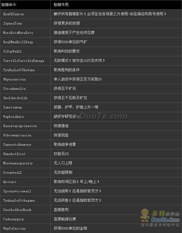 秘籍作用TerribleTerribleDamage无敌模式WhySoSerious5,000,000,000资金(剧情模式)MoreDotsMoreDots取消 建造建筑费用YpoonsVoicemail取消 失败条件TyuHasLeftTheGame取消 胜利的条件SoSayWeAll取消 科技的要求Stroaksmolts5,000晶矿Smoldersbolds5,000矿 + 气RealMenDrillDeep5000气IAmIronman武器,盔甲,盾牌升1级,研究所有技能EyeOfSauron解锁所有剧情影片必须在任务场景之外使用-如在海伯利昂号中使用JaynesTown获得更多的资源FSBComunicacion快速治疗ReversingNazaire快速建筑DZMHairSpring资源自定义?需要测试,可能格式:"DZMHairSpring<#>"SawnOutOfMemory消除迷雾效果Qrotero取消 日夜交替MintmansOperator无限人口CadEasyGoin立刻失败cMethodFeedback立刻获胜LyingPect选择剧情任务WapBoinkers获得研究点数(剧情模式)HanShotFirst取消 技能冷却时间Furabranchery打开UNN新闻播报列表(剧情模式)OverEngineeredCodPiece播放歌曲"Terran up the Night"=