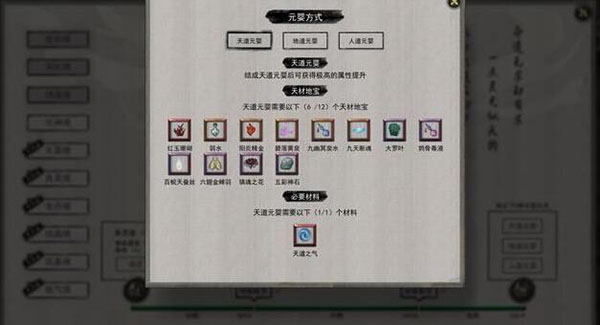 元婴方式共有三种,最好选择属性提升最多的天道元婴,需要六个天材地宝与一个天道之气。