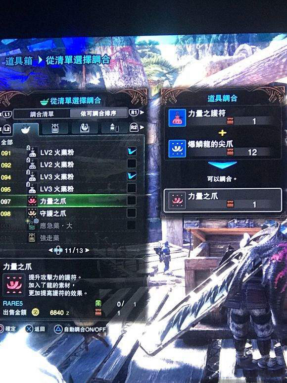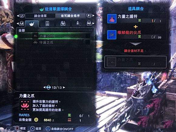 合成的方式很简单别看99那是上限,其实只需要一个爆鳞龙的尖爪+力量护符,即可合成。守护爪雷同