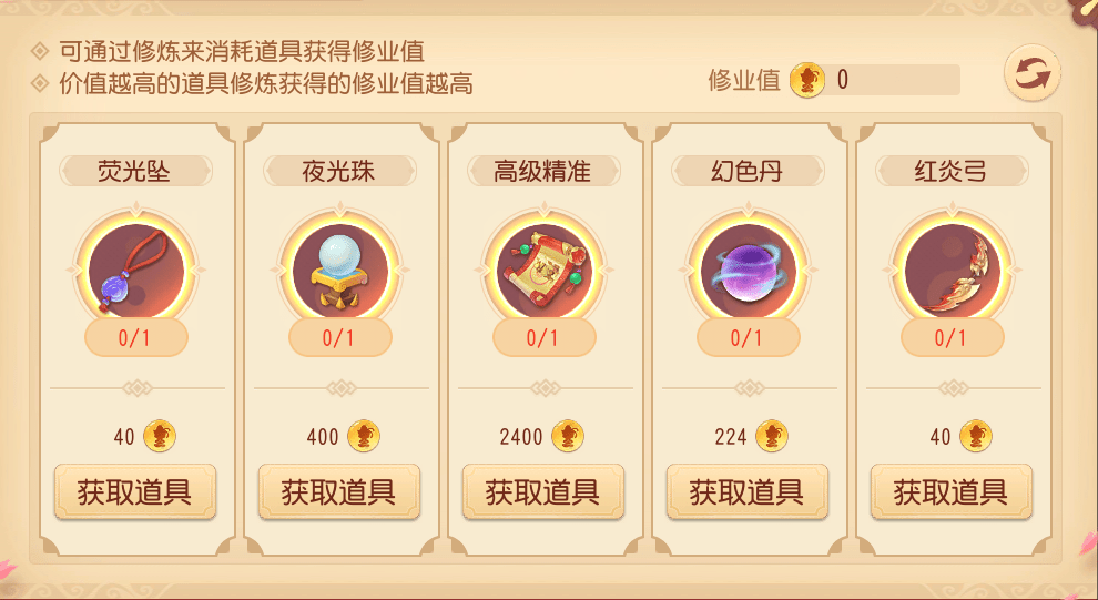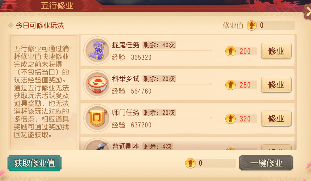 进行五行修业需要少侠消耗修业值,而修业值可通过修炼来消耗对应的道具来获取,每种道具都会对应一定的修业值,价值越高的道具修炼获得的修业值则越高。可供消耗的道具一般为装备、五宝、友好度道具、 召唤兽道具等,其中可获得较高修业值的道具是高级兽诀(2400点)与宝石锤(2304点)。少侠们可以通过在平日积累道具,或是用金币在摆摊界面进行交换,即可获得大量修业值噢!每消耗一个道具,就会补充新的道具清单,若少侠不想交换当前的道具列表,也可使用右上角的刷新功能,消耗1000金币即可更新列表啦。