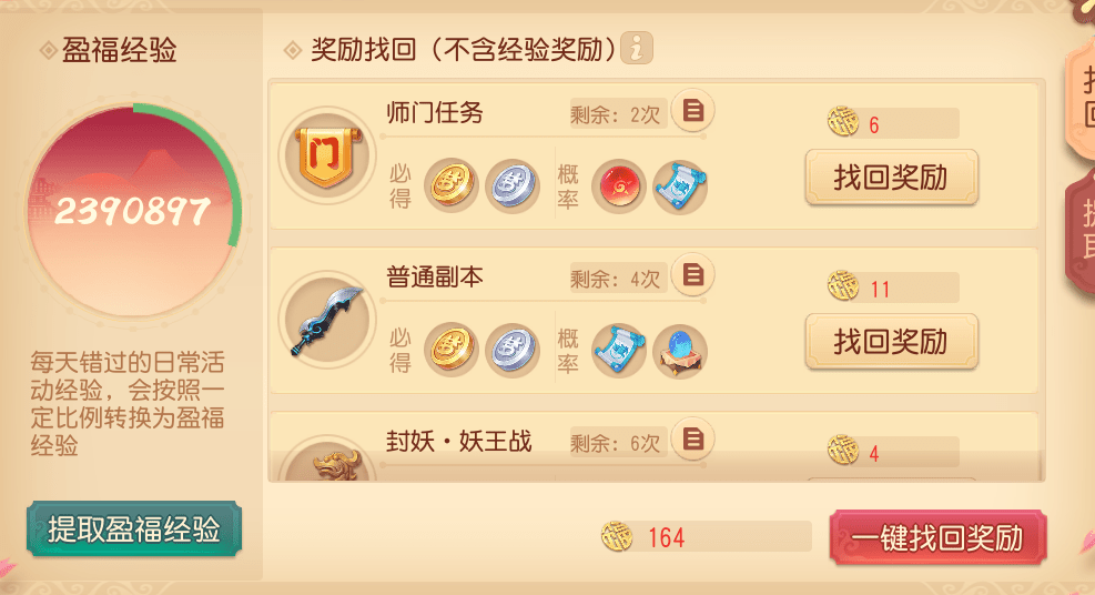 说到拿回错过的奖励,除了五行修业玩法,还有我们的【找回奖励】玩法噢。不同的是,找回奖励中会消耗通福币,而通福币只能通过消耗仙玉1:1进行兑换,不过通福币可用于直接提取盈福经验,也可以用于找回道具奖励,除了金币与银币外,还有机会获得珍贵道具噢!