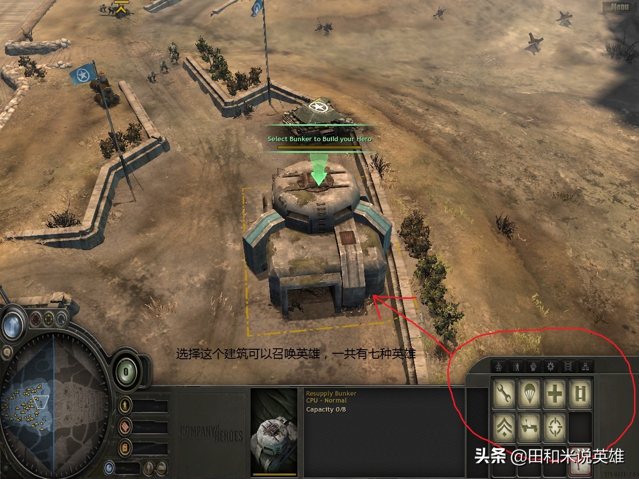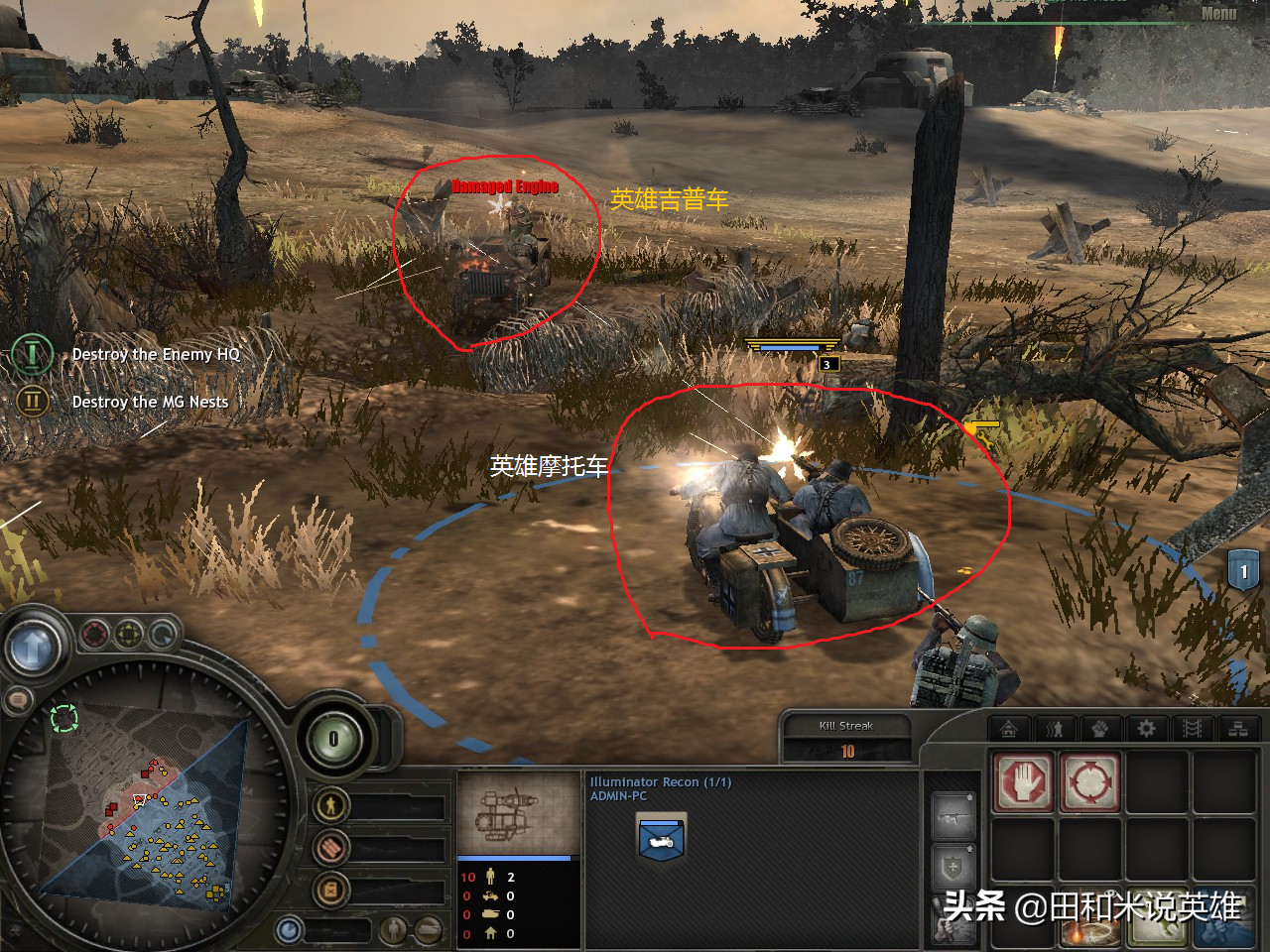 英雄吉普车:盟军是吉普车,德军是摩托车。刚开始我以为吉普车可以克制狙击手,后来试了,发现不行,没有伤害加成。更坑爹的是,机枪堡垒旁边的反坦克炮对英雄吉普车杀伤力很大。实战中吉普车很容易被打爆。个人认为,这是最没用的英雄单位。