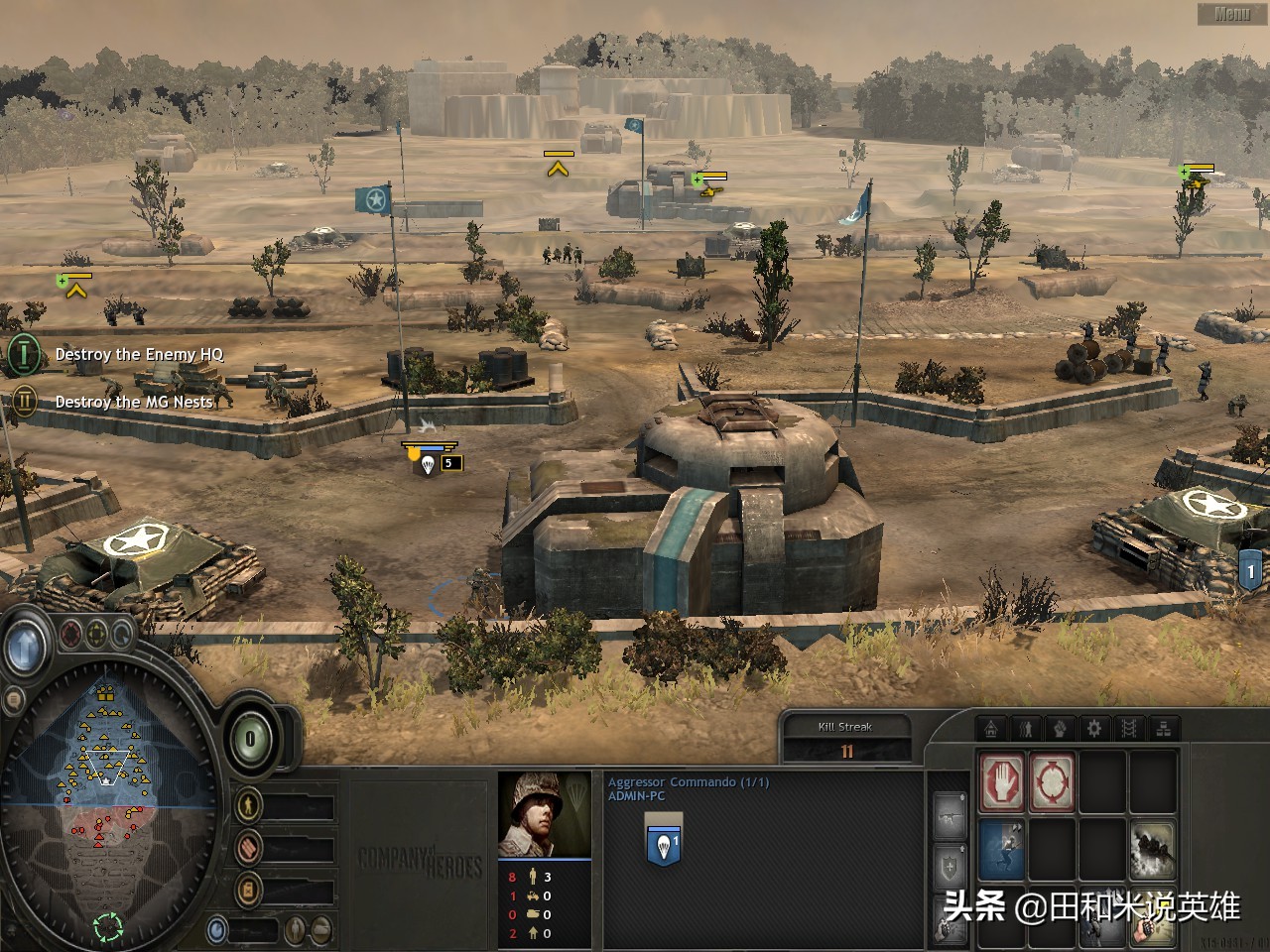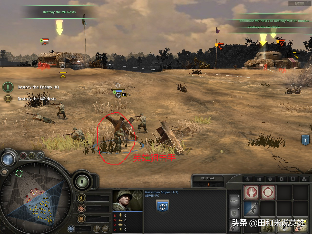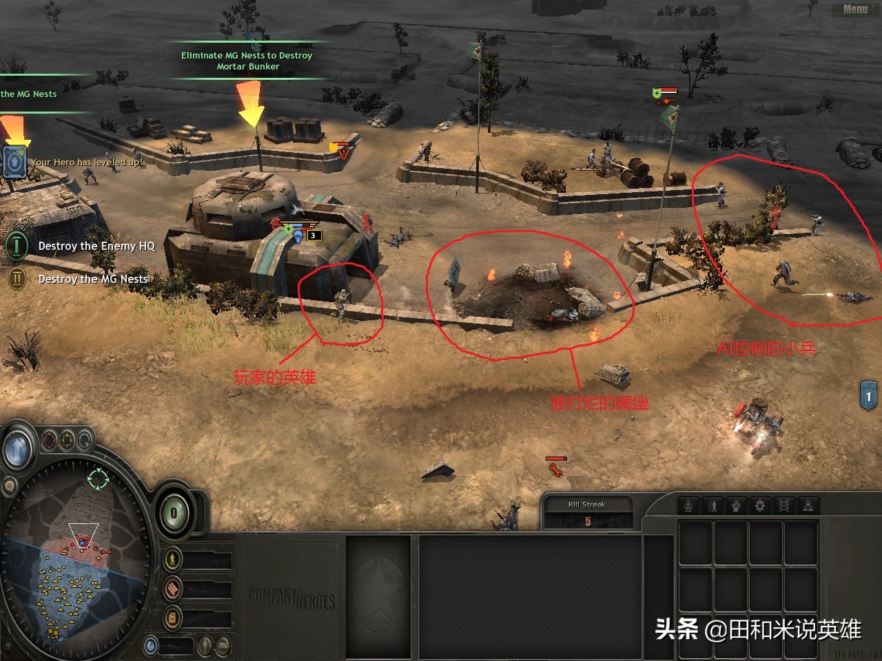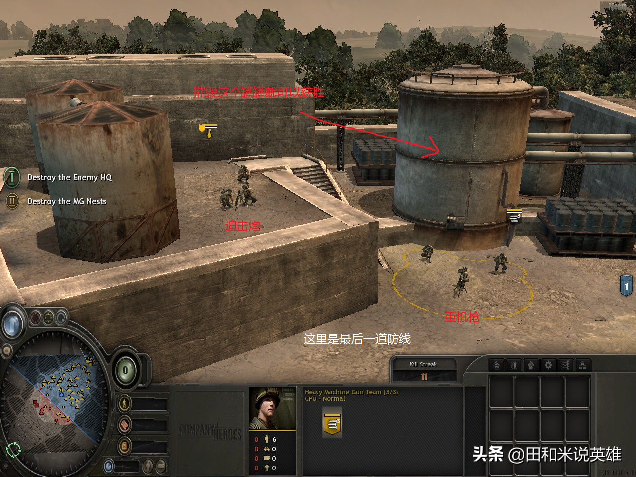 最后打到对方最后一个建筑的时候会遇到迫击炮,但此时英雄的等级都很高了,基本上小兵包括迫击炮都伤不了你!迫击炮前还有一挺机枪,英雄狙击手直接远射就好,英雄突击兵用跑步技能冲过去,然后消灭机枪,再打烂敌方建筑就可以取胜。