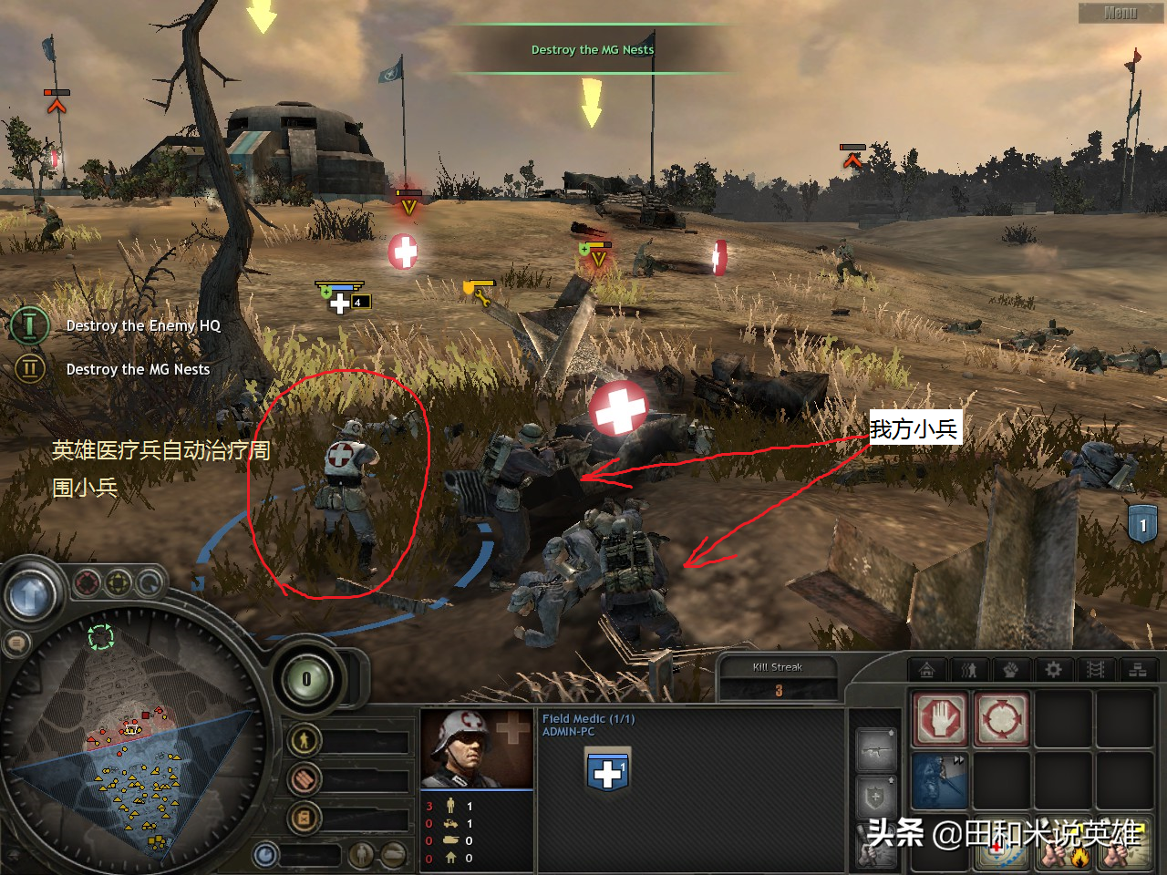 英雄医疗兵:可以被动治疗周围的我方小兵,还可以主动技能治疗小兵,这个有点意思,拥有燃烧手榴弹和爆炸手榴弹技能。