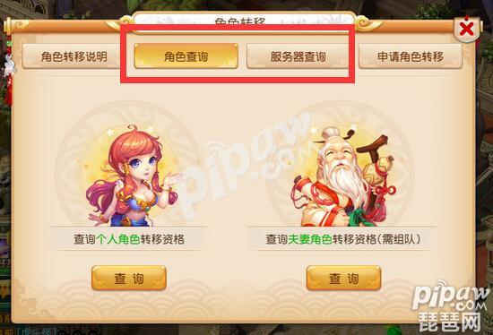 去找宝象国NPC角色转移使者,选择“我要角色转移”,然后里面有个角色查询和服务器查询,只有两个条件都符合的情况下玩家才能正常转服。