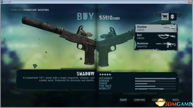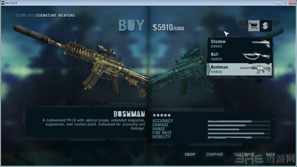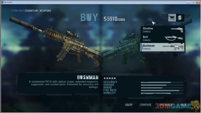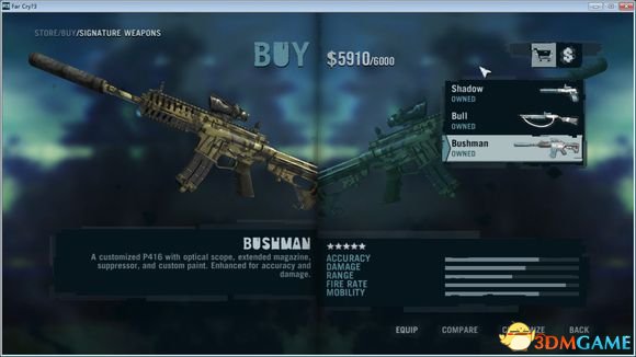 我们都知道《孤岛惊魂3》拥有一个非常庞大的武器库,除了常见的狙击枪、冲锋枪、手枪等常规武器之外,更有明朝古董刀、兰博弓等奇葩武器。而获得武器的途径,除了商店、手工制作外,通过一定的条件解锁隐藏武器也是一种途径。目前已经被玩家解锁条件的隐藏武器只有7种,下面我就来说下。 第一种:定制的P416步枪——Bushman 这把枪解锁的方式很简单,只要解锁18个信号塔就能得到这把具有消音瞄准功能的P416,里面40发子弹。