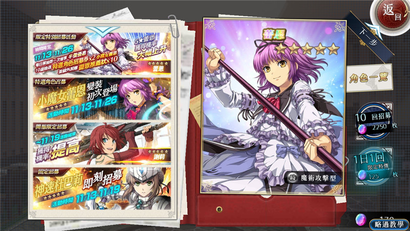 相信每个轨迹玩家都有自己喜欢的角色,本作的人气角色都是通过招募获得的。虽然绝大多数玩家可能会通过刷初始来招募SSR角色,但是本作还有一个非常另类的设计。比如说小魔女玲无法通过游击士币招募,只能通过10连招募其他池子的角色所赠送的2枚特殊招募卷,所以这完全是欧皇才玩得起的啊。