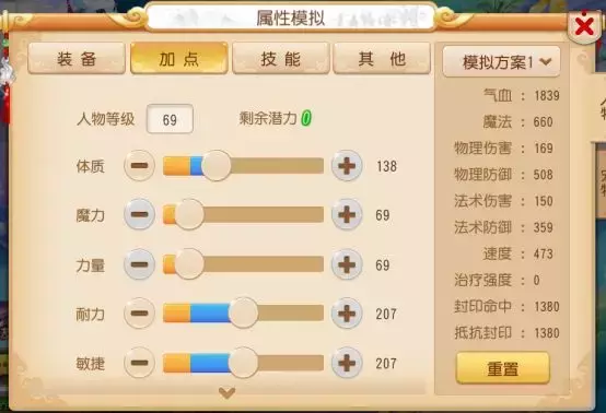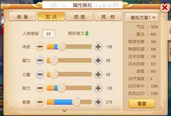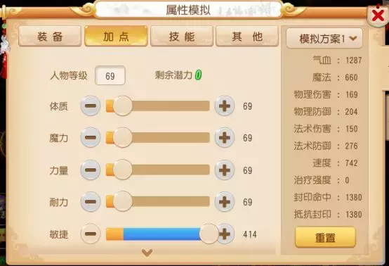 这是一套追求极致速度的加点方案,因为女儿村目前是以封印为主,所以在战斗中抢得先手是很重要的,而这套5敏正好可以保证你拥有最高的速度优势,但是这套加点对装备等方面的要求较高,如果搭配得当的话,会有一个不错的效果。