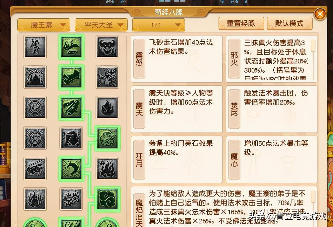 其实综合看来,魔王是加强了点杀能力,可是飞沙走石的伤害能力是降低了,之前如果不点神焰经脉而是点崩摧经脉,可以降低法爆对象10%法防,这样秒法系都非常的疼,现在为了照顾魔冥,燃魂的经脉不能点了,燃魂经脉造成的法术伤害等于当前魔法处以魔法上限乘以4%,这里可不可以理解为满魔王状态下以10000魔法为例可以多秒400血?(或者理解为这个经脉只加0到4%的法伤结果,相当于2级法修)