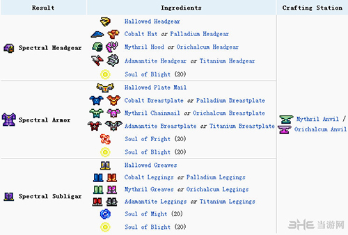使用神圣套、枯萎之魂、恐惧之魂和肉山后新三矿的套装对应的部件在秘银砧/山铜砧处合成。