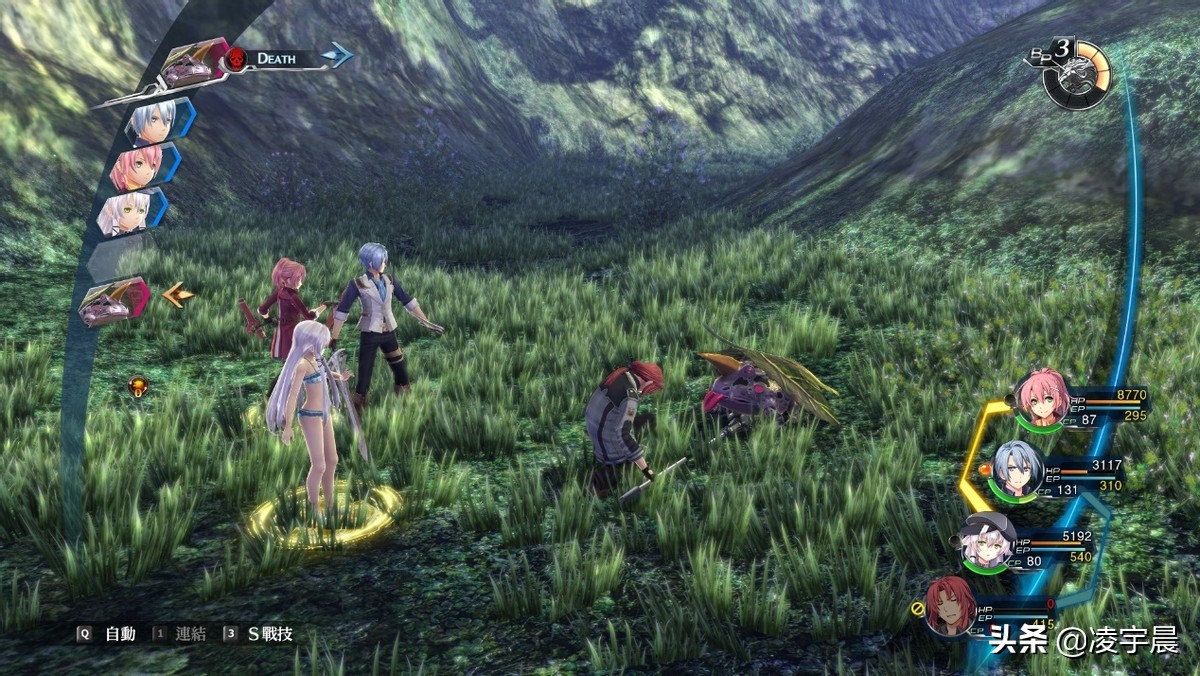 这里还必须提醒一下新手同学在迷宫中行动时注意所谓的先攻问题——其实道理大家都懂,就是看到怪物后先攻击让其眩晕后,再和其接触进入正式战斗。为什么要在这里强调先攻的重要性是因为《闪之轨迹4》的难度曲线并不是很平滑,开场序章艾丝蒂尔那群人80多级各种无双暂且不提,以悠娜为主角后咱们队伍里都是20几级的小朋友,而通过了初始试炼迷宫后等级一下子就被系统拔高到50级。本以为可以大展拳脚,结果没想到从霭灵之里刚出来到森林场景就各种不科学。