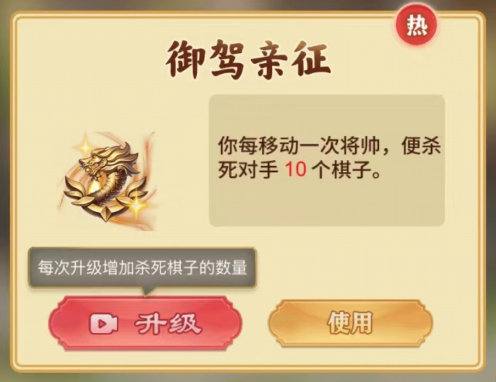 再看看这个技能,御驾亲征,每移动一步“帅”就可以击杀对方额外的棋子,这不废物技能嘛~