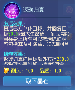 激活效果:直接复活并回复50%最大生命值的技能,返璞归真可以迅速复活起来被失心封杀倒地的大唐,并且让大唐当回合就能横扫出手。