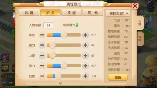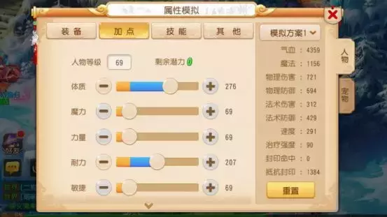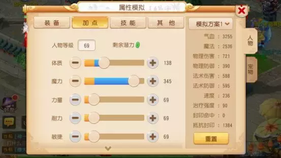 这是一套趋于保守派的双抗性加点,2耐2魔能使你无论是在对抗月宫还是大唐这样的物理门派,或是龙宫、魔王的法术门派,都能牢牢站得住脚。另外在保证抗性的同时1体也提供了一定的血气加成,所以推荐在PK中使用。