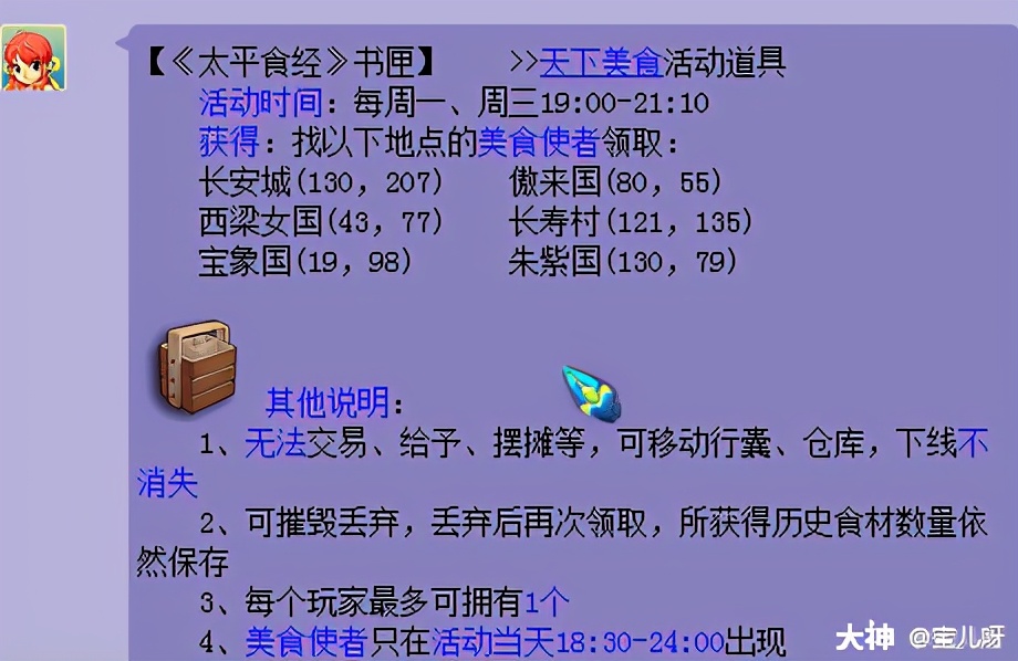 击杀美食后,有几率获得美食材料,美食材料需要领取《太平食经》书匣。