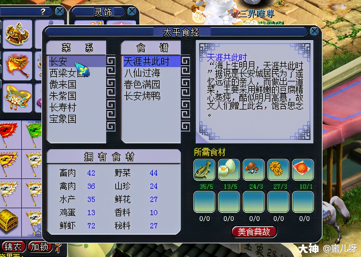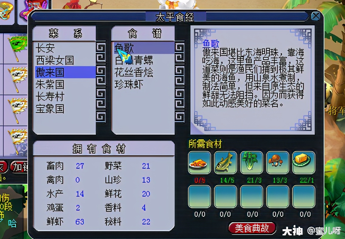 此时可以看到小肥皂的食材已经很少了,做美食典故已经做完了,所以。还是要继续努力杀妖怪获取食材。