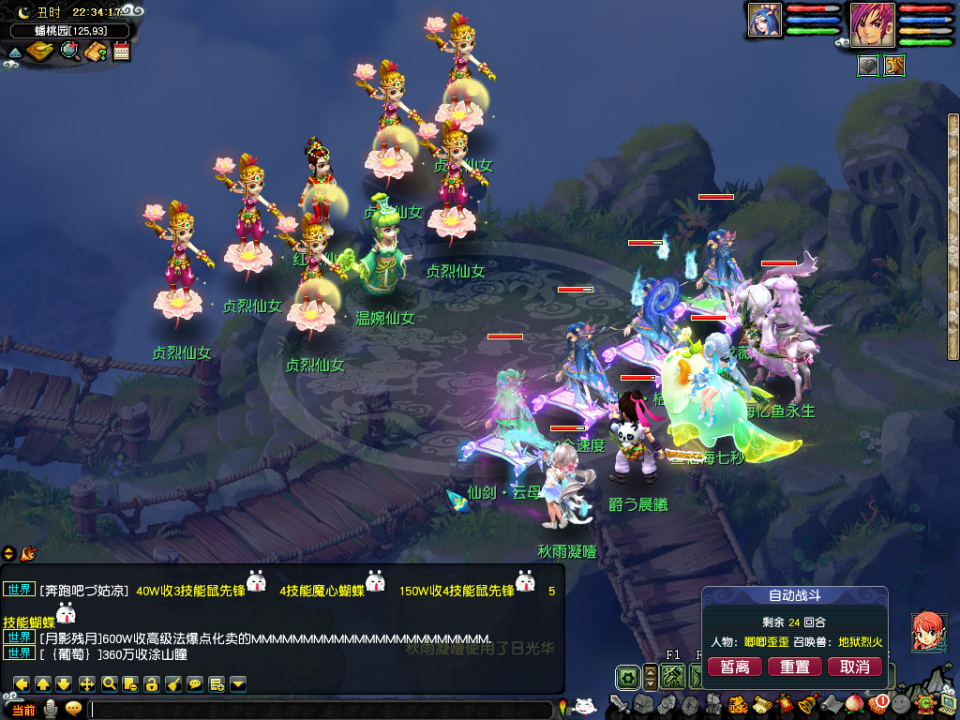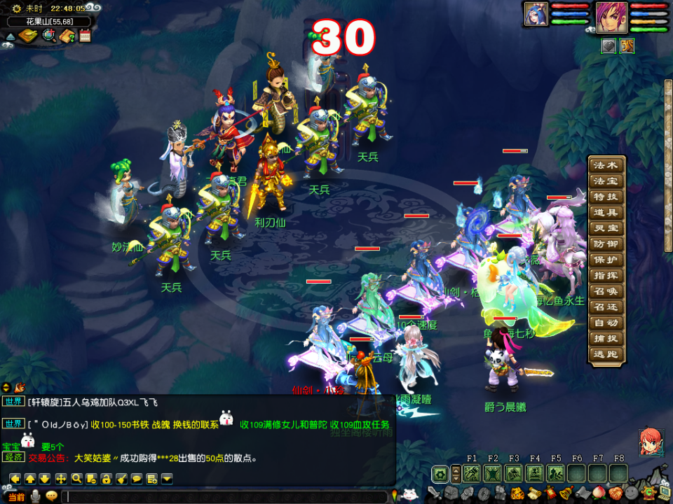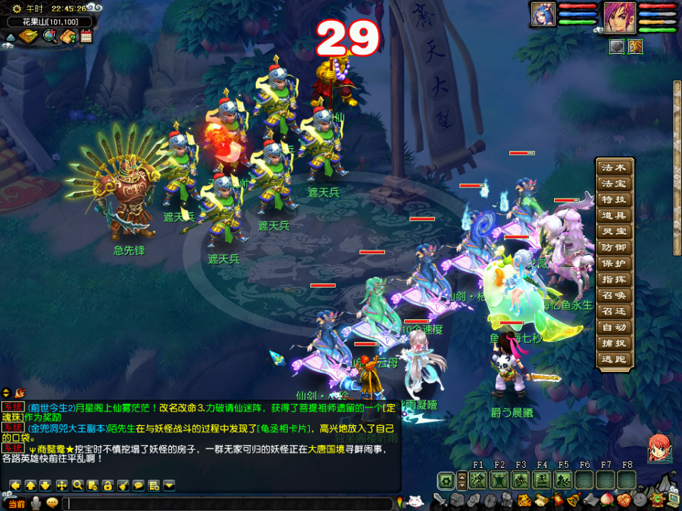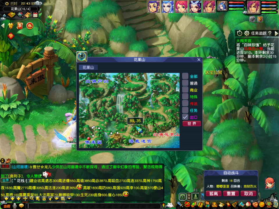 然后到花果山地图,在全地图找饥饿的小猴,然后给予背包里的百味珍馐。完成10个任务以后会在花果山中间和右边的山峰刷新天兵天将,两个都一样,队伍有封系的先封印主怪,否则主怪会一直召唤天兵,然后用2只须弥秒大力,大力血少,否则第二回合会后发宝宝。