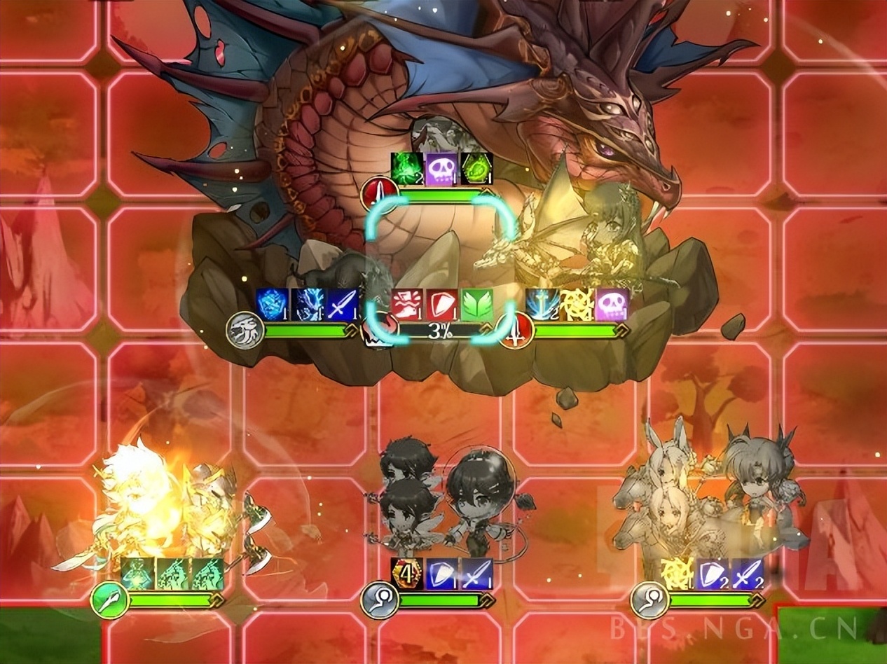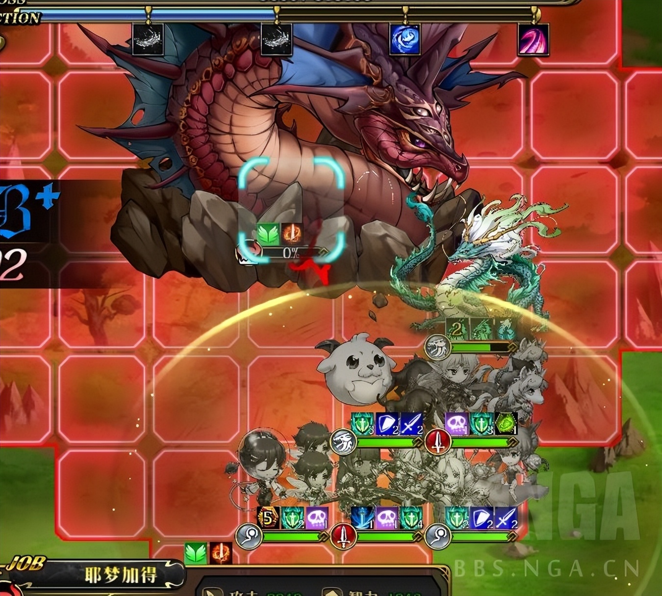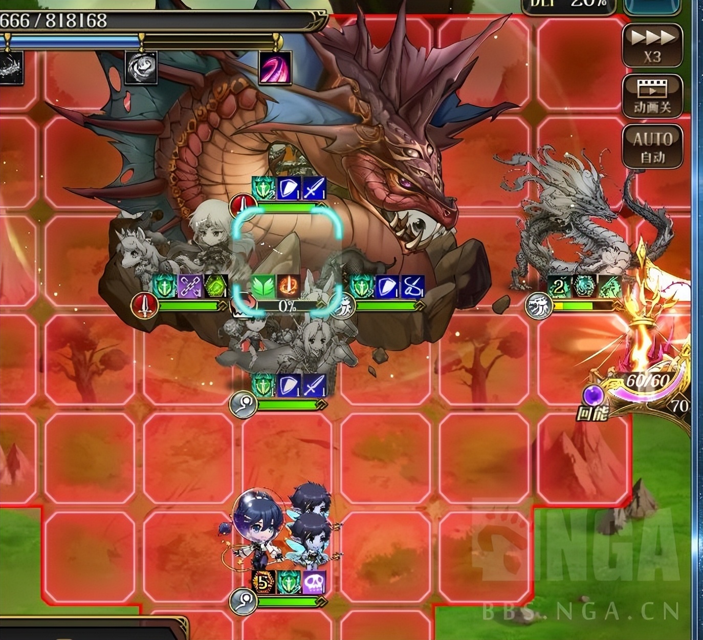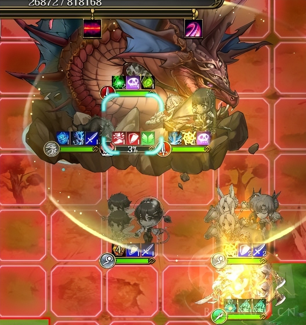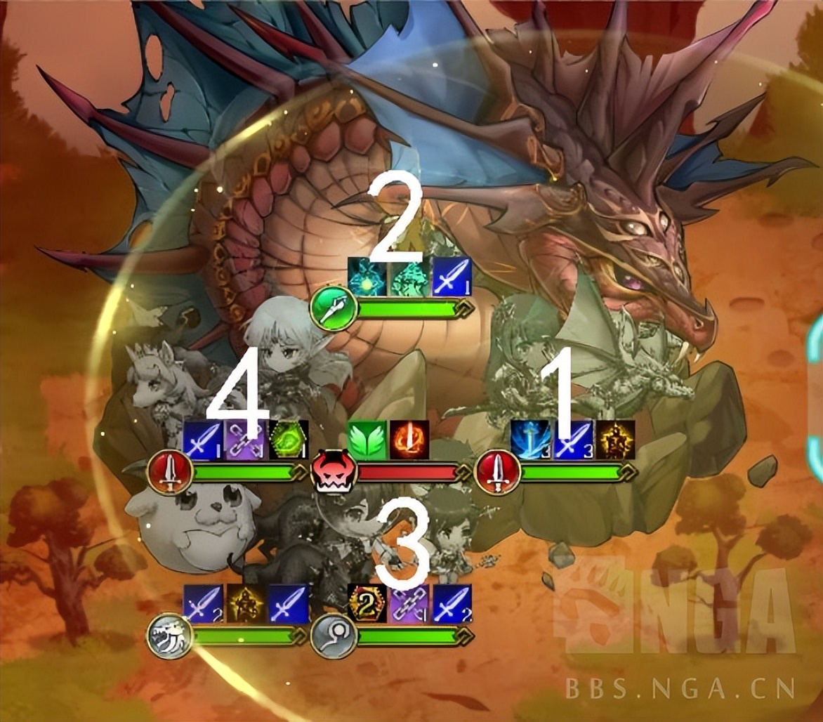 办法二:走位规避,全体出圈,boss周围两格范围内不存在友军,boss便放弃技能,进行普通单点。从而生存下来,下见走位图。