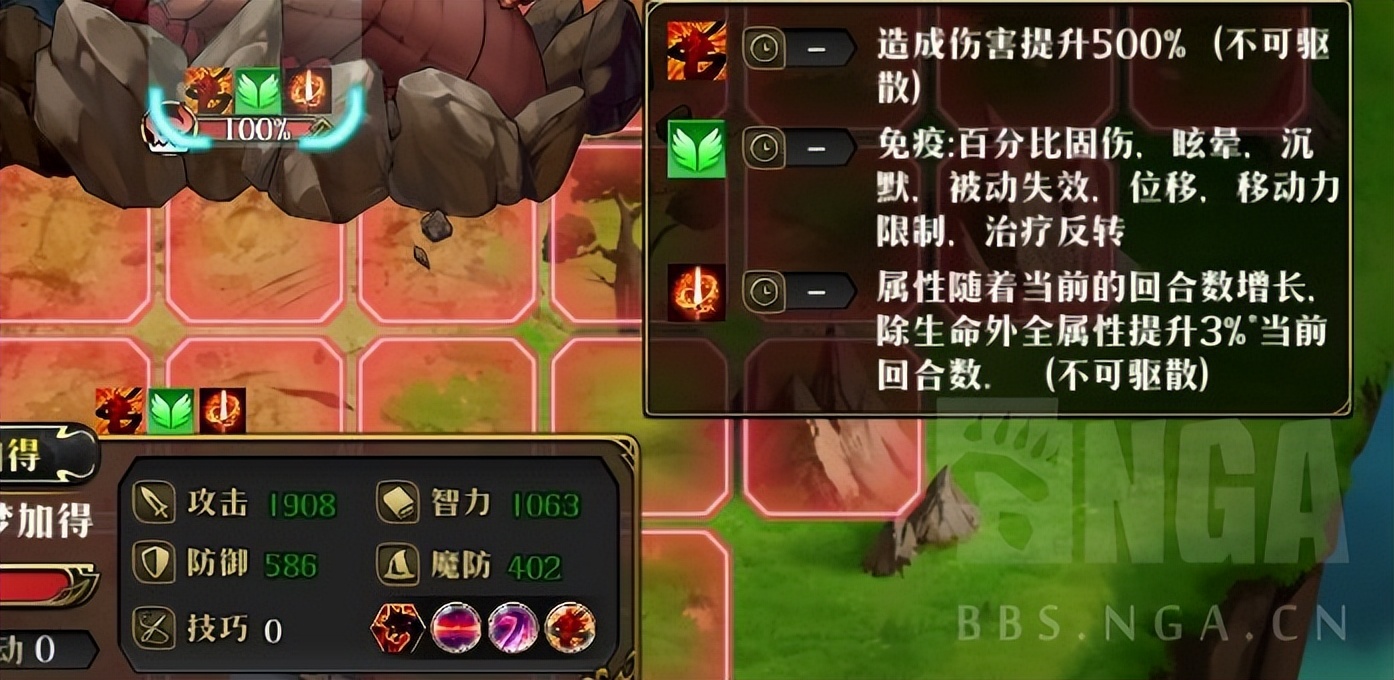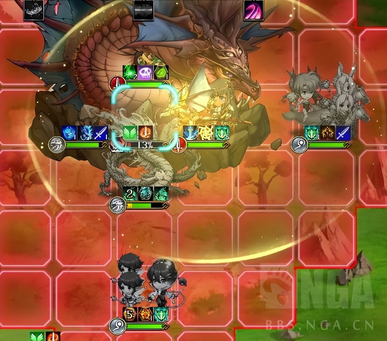 技能讲解到这里就结束了。不过还有一些小注意点。比如boss自带地形的,boss是站在树林上的,部队作战的时候会有防御加成,可以用其他的地形技能进行覆盖。比如古巨拉的3C跳水和冰霜之息,阿尔弗雷德的专属让boss一直泡水解除防御地形即可。
