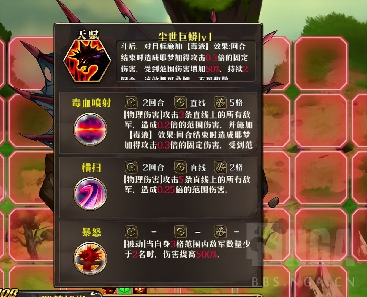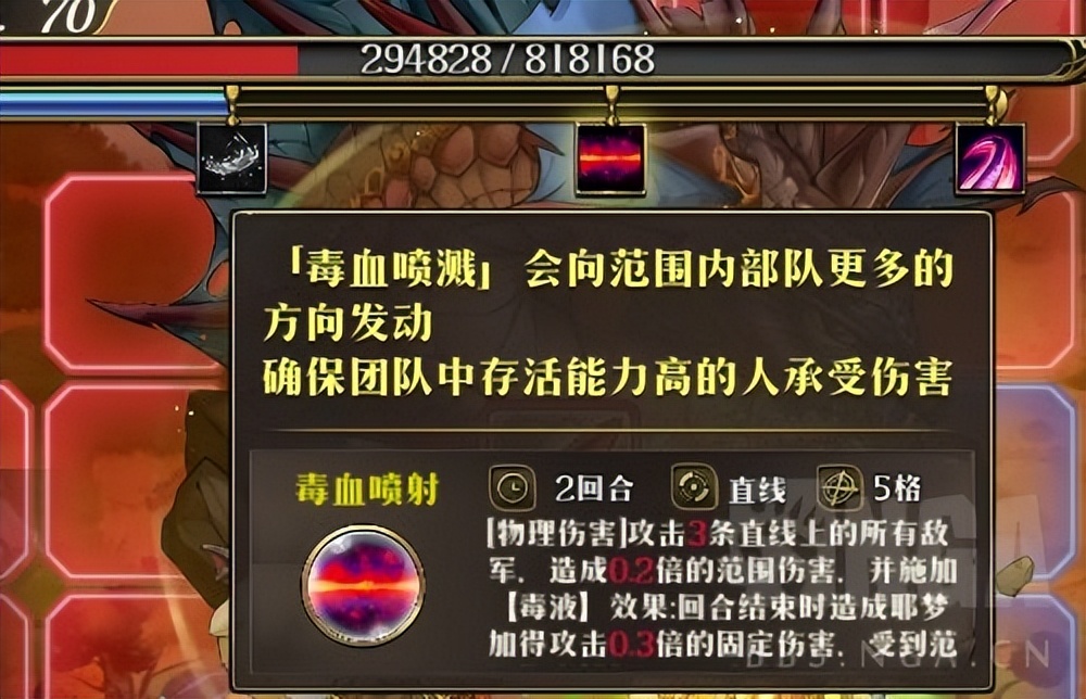 二技能毒血喷溅:三条直线的AOE附带高额固伤。前期还能扛,后期直接团灭点。