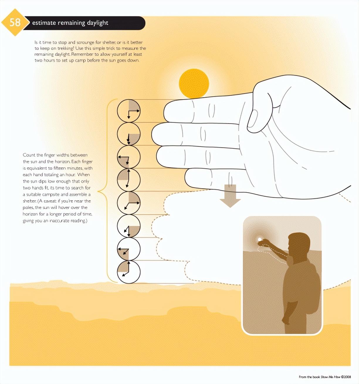 学会用手指查看剩余的日光时间,一指等于15分钟。