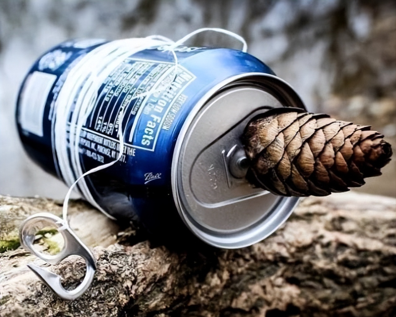自制易拉罐钓鱼装置,取下拉环并将其做成钩子,将绳子绑在外面,然后把一些东西放进罐子的口中,防止它下沉。