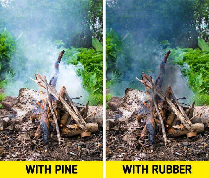 当你需要发出信号时,最好在火焰中加入松树枝和橡胶类的东西。这会产生很多明显的黑烟,别人更容易发现你。
