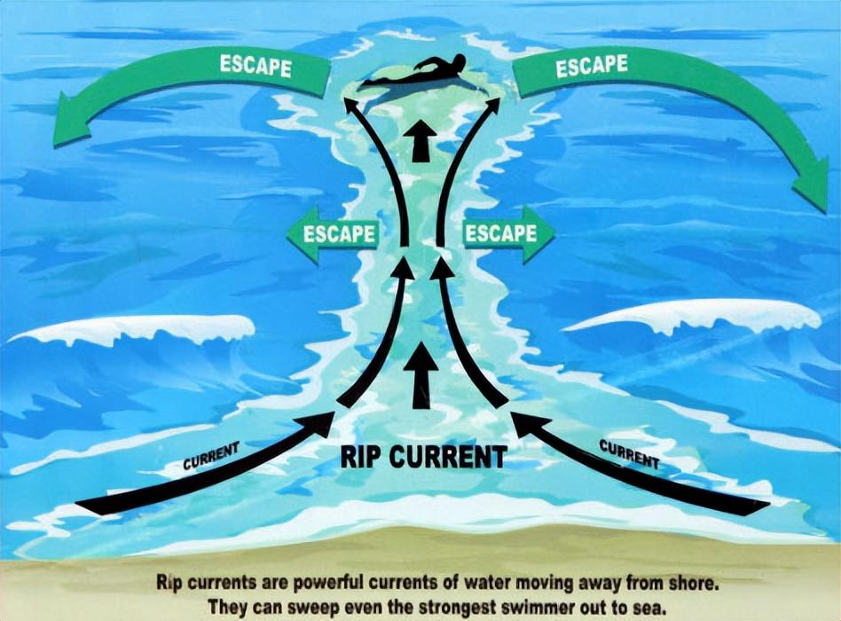如果你被激流困住,不要急着游到岸边。相反,垂直于岸边游泳,直到你离开水流,然后再往岸边游。