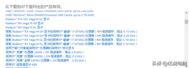 3.核显,核显分AMD和英特尔的,AMD的跟独显一样,去官网找个自己的型号下载就行了,我们来看看英特尔的核显怎么下载。百度英特尔官网,或输入网址www.intel.cn,进入英特尔官网,点击左上方的支持按钮,在弹出的窗口选择下载和驱动程序,再选择浏览和查找驱动程序,再选择显卡驱动程序,找到适用于我们CPU的核显驱动后点击一下进入下载界面,看看界面下方的支持列表里有没有我们的CPU型号,如果有说说明我们的CPU核显可以用这个安装包,确定没问题了在界面左侧点击下载。英特尔提供了.exe和.zip两种格式,下载完了直接下一步下一步安装就可以了。