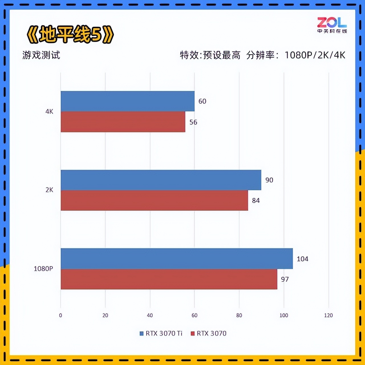 在2K分辨率下,以《地平线5》的测试数据为例,GeForce RTX 3070和GeForce RTX 3070 Ti在1080p分辨率下都达到了100帧左右,2K分辨率下平均降低10帧左右,但依然可以非常流畅的运行。