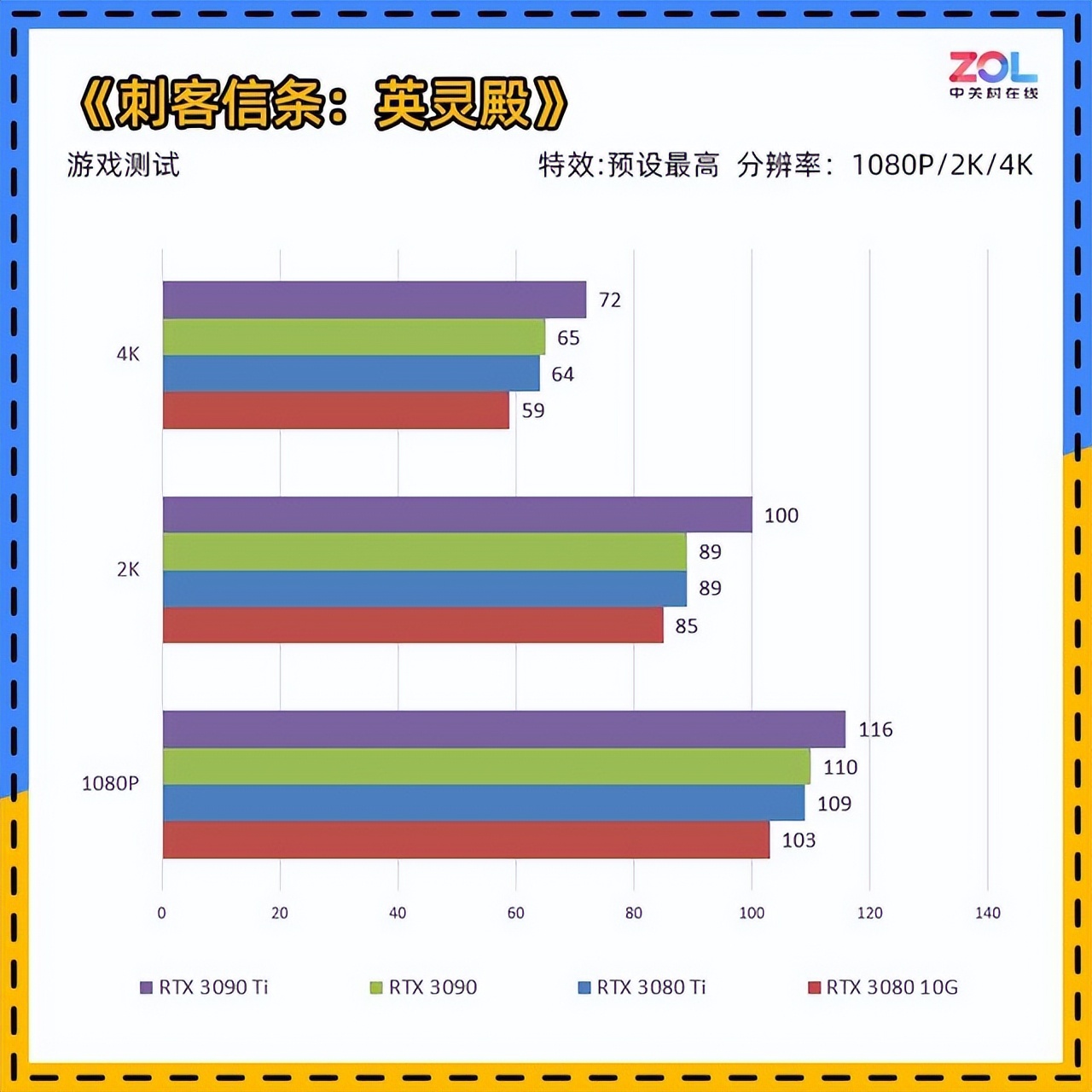 以《刺客信条:英灵殿》的测试成绩为例,在1080p分辨率下,4款高端旗舰级产品都能达到100帧以上的电竞级水准。而在4K分辨率下,RTX 3080 10G基本可以算作60帧流畅,而再往下的中端显卡,则很难达到。