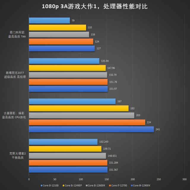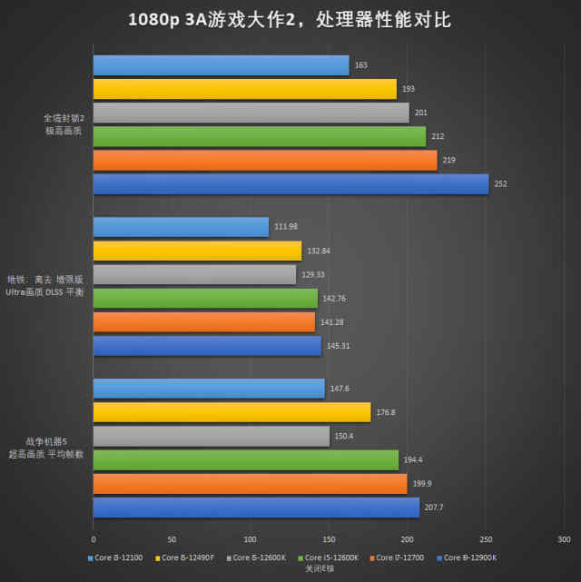 这里我们为何会分出3A游戏大作2呢?实际上,经过多次测试后发现i5-12600K处理器在上述的三款游戏均不太理想,于是我们在BIOS里关闭了i5-12600K处理器的能效核心重新测试一轮,这时所有处理器的性能表现都是正常的了。