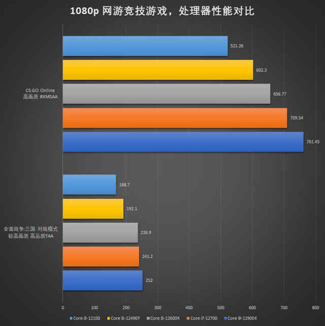 在《CS:GO》游戏中,我们更能看清楚,在同一款旗舰显卡的情况下,不同档次的12代酷睿处理器的游戏性能表现差别。当然数字看着差别很大,但是当游戏帧数过144FPS后,普通玩家的肉眼就已经很难跟上了。