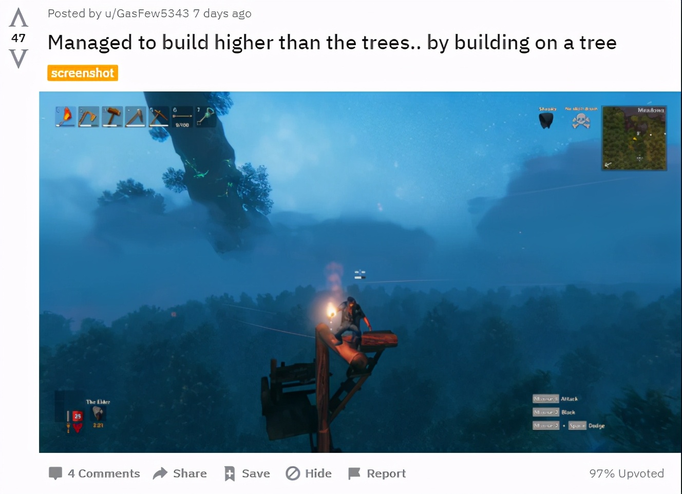 被大树击杀过的萌新多半会产生心理阴影。一位玩家干脆找了一棵全地图最高的树,在树上建立基地,这样就不用担心大树砸到自己了。