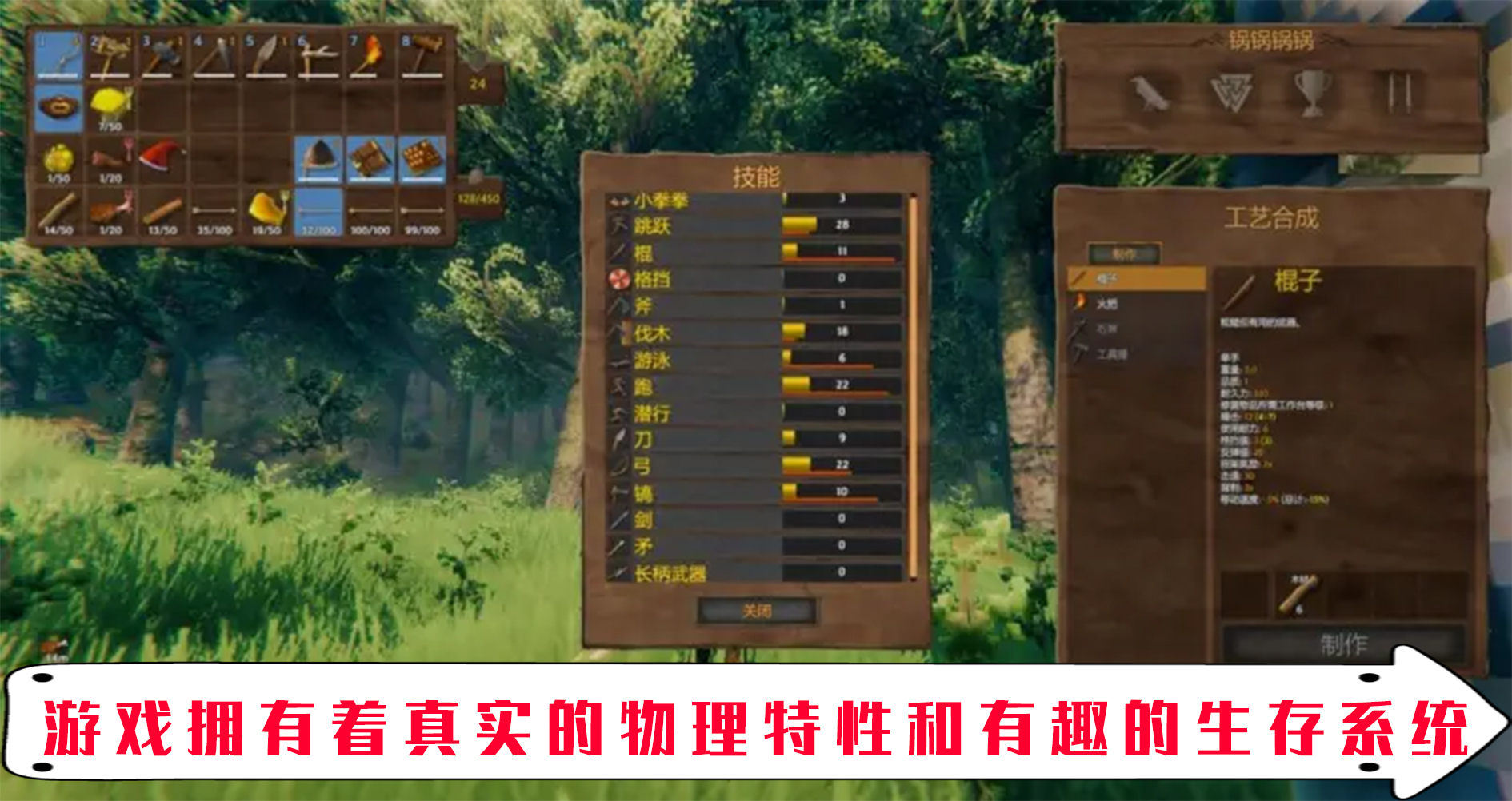 该作拥有着真实的物理特性和有趣的生存系统,此外玩家控制的英灵战士也拥有着血条和耐力的设定,想要增加这些数值的上限则需要进食不同的食物,同时游戏在打造物品的工作台系统上和《饥荒》十分相似,唯一在于工作台的升级上面略有不同。