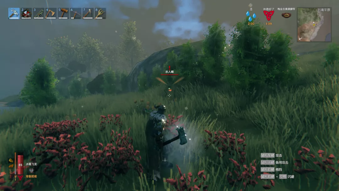 玩到后期你会发现,虽然《英灵神殿》里只有五种地图环境,但每种地图都有若干个特色非常鲜明的挑战和威胁。沼泽的毒与潮湿,雪山的狼与严寒,北境平原的杀人蜂,都各具特色,迫使玩家用不同方式应对。这些地形的位置随机生成,又无缝互相接壤。特别是北境平原,作为当前版本等级最高的地图,其边缘地带总游荡着“杀人蜂”,飞行速度快,看似不起眼,伤害却很高,对小号几乎一击毙命。这使得北境平原在游戏的开荒的部分时期中,对玩家都有着极高的威慑力,基本上不幸误入就得马上落荒而逃——反过来也增加了冒险的刺激感。