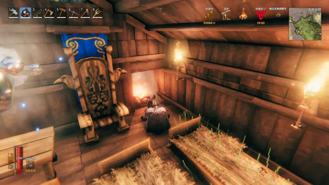 换句话说,《英灵神殿》降低了“生存”的绝对难度,转而以鼓励的形式,给玩家“如果我生存得体面一些,我的游戏体验更更好”的正反馈。这种正反馈绝不仅仅是玩家的自我精神追求,而是实实在在的游戏设计。比如在在建造良好的屋子内休息,你可以获得休息Buff,这个Buff的效果是极大提升血条和精力的恢复速度,总之大有裨益。而游戏里有个设定是,你休息的环境越好,Buff的持续时间就越长。
