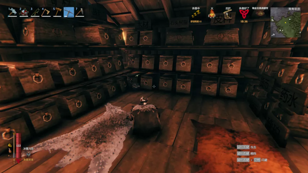 这里的友好,并不意味着简单,游戏的挑战性依然很高。由于死亡惩罚很大(掉落所有装备,只能光着身子跑过去拾取),第一次去探索陌生地图经常要做充足的准备。我还清晰地记得我们三个人第一次出海寻找沼泽的时候,足足在家准备了十来天(游戏时间),升级装备、准备食物和药品,还要等个比较好的天气才容易出海。