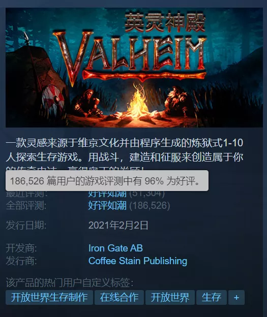 加上《英灵神殿》也没有采用某个天然吸量的题材——维京神话在中西方都算不上什么热点,在国内属于流量洼地;它也没有很出彩的特色和很新颖的创意,游戏内容概括起来就和它的低模画面一样平凡:在程序随机生成的维京神话世界里,生存、建造,战斗,创造你的冒险故事!看,多么缺乏新意,Steam上平平无奇的三线生存游戏太多了,而《英灵神殿》的精神面貌……看上去和它们并无不同。