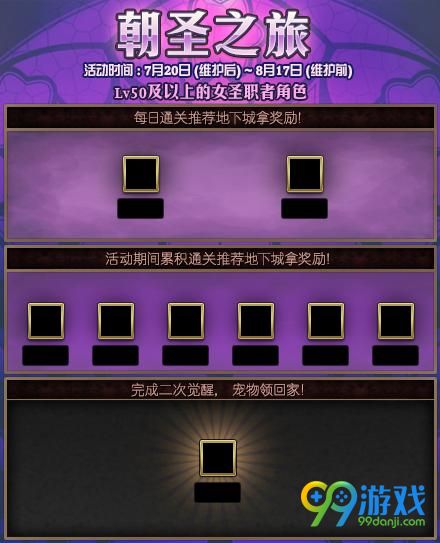 女圣职者二觉任务有一个朝圣之旅活动,女圣职者决赛50级以上可以参加,完成后可以赠送很多丰厚奖励,还能获得宠物哦,活动时间是7月20日-8月17日。