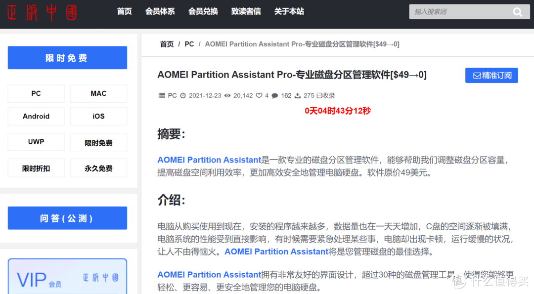 比较赞的是,这个网站也有不少限免活动(就是那种限时免费拿,过期就收费那种),譬如这个AOMEI Partition Assistant Pro-专业磁盘分区管理软件,原价要49美刀,限免领取。一经入库即可永久使用。